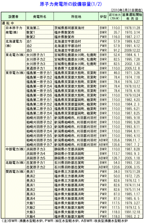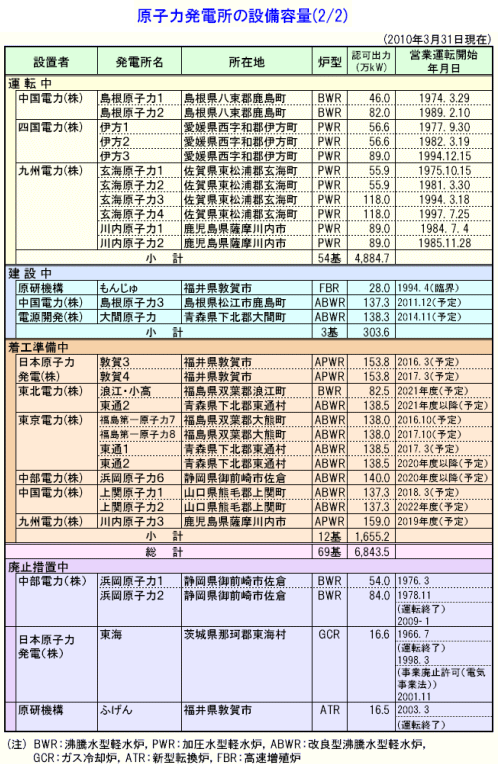 2010年3月31日現在、日本の商業用原子力発電所の数および認可出力は、運転中のもの54基(認可出力4884.7万kW)、建設中のもの(もんじゅを含む)3基(認可出力303.6万kW)、建設準備中のもの12基(認可出力1655.2万kW)です。