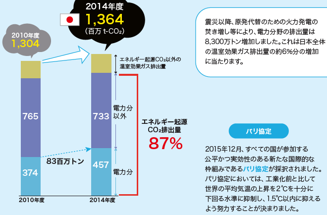 東日本大震災以降、日本の温室効果ガス排出量は増加し、2013年度には過去最高となりました。